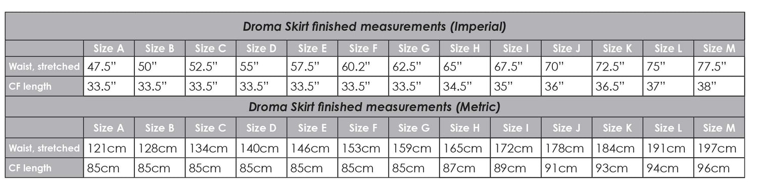 Compare your waist and hip measurements to the size chart above to select your base size. If your waist is two or more sizes smaller than your hip, you may want to select a size that falls in between them. Check the finished measurements below to ensure that the finished waist (stretched) is bigger than your hips to ensure you can get the skirt on!