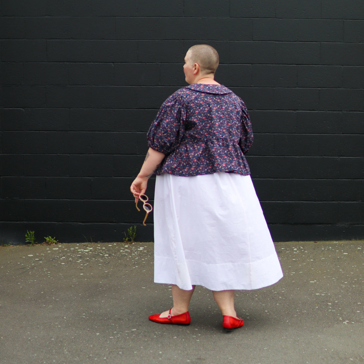 This pattern is designed to be sewn with woven fabrics without stretch and is designed for use with a wide variety of light-medium weight woven fabrics. The sleeves will look best in a fabric with a bit of body. We suggest light-medium weight linen, cotton lawn, silk noil, seersucker, cotton poplin.